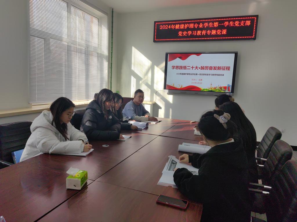 为深入学习贯彻党的二十大精神,引导我支部学生党员做到学史明理、学史增信、学史崇德、学史力行,弘扬爱党、爱国、爱校、爱专业精神,进而充分发挥其示范、引领、服务的作用。2024年3月4日,健康护理专业学生第一党支部在1#2104会议室组织召开以“学思践悟党的二十大•踔厉奋发新征程”为主题的党史教育专题党课学习活动。本次会议由健康护理专业学生第一党支部党员教师赵勇同志主持。支部在校学生党员6人全部参会。