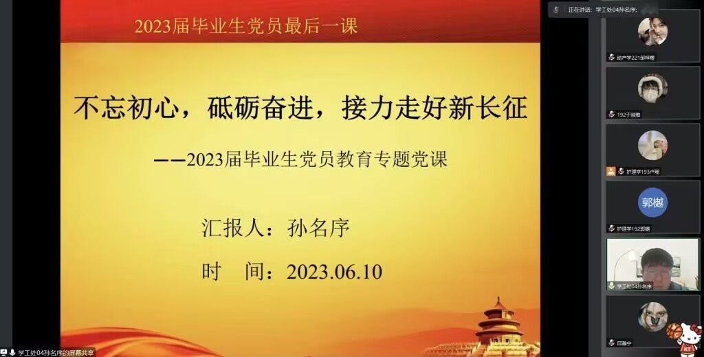 2023年6月10日,在毕业生党员即将走出校园、步入社会之际,齐齐哈尔工程学院健康护理专业学生第一党支部书记孙名序主持召开了此次会议。