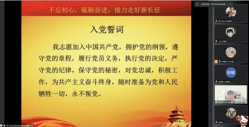 目的是教育引导毕业生党员持续发挥党员的先锋模范作用,走向社会后保持共产党员先进性。首先,孙名序老师为大家讲解了毕业生党员提示卡相关内容,并且带领学生开展了“三个重温”的主题党日活动,其中包括“重温入党志愿书、重温入党谈话、重温入党誓词”。阅读了《准则》和《条例》。仔细讲解了党内法规层级、党内法规基本情况、党内政治生活基本准则以及《中国共产党党内监督条例》。通过组织“三个重温”,教育引导党员毕业生牢记初心使命,努力践行“两学一做”,践行“四讲四有”,详细讲解了“四讲四有”中讲政治、有信念,讲规矩、有纪律,讲道德、有品行,讲奉献、有作为的基本内涵,争做合格党员。同时做好毕业生党员组织关系转接工作。其次,孙名序老师详细讲解了组织关系转接等相关要求,进一步明确组织关系转接流程,确保每一名毕业生党员离校后都能按规定纳入组织管理,进一步强化毕业生党员的身份意识、组织观念。做到“五个讲明”,一要讲明可以接收组织关系的单位;二要讲严提供准确信息的重要性;三要讲透组织关系转出程序;四要讲清党员档案归档材料和存放地;五要讲解毕业生党员的责任和义务。最后,孙名序老师代表健康与护理系党委对毕业生党员表示祝贺。同时希望全体毕业生党员能够坚定理想信念,不忘初心、方得始终,铭记校训、砥砺前行,时刻弘扬艰苦奋斗的精神,为全面建设社会主义现代化国家做出更大的贡献!