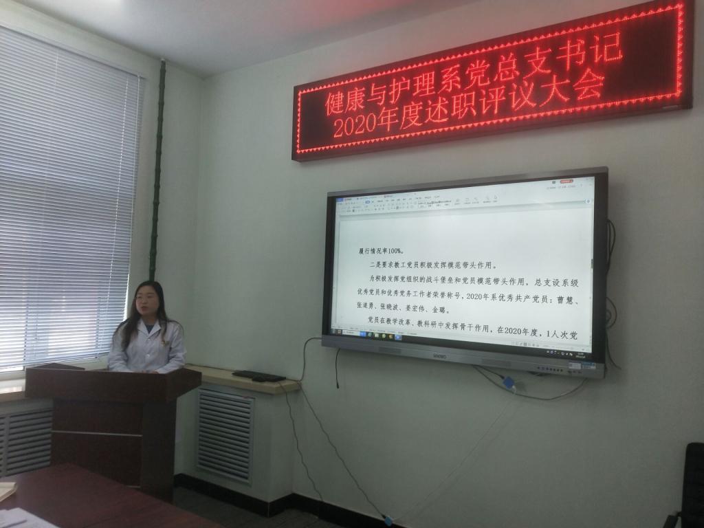 健康与护理系2021年1月8日在1#2104召开了2020年度党总支书记述职评议大会,曹然彬院长、系党总支书记张静、14名党员教师现场参加会议、29名学生党员线上参加会议。系党总支宣传委员张林琳主持会议。