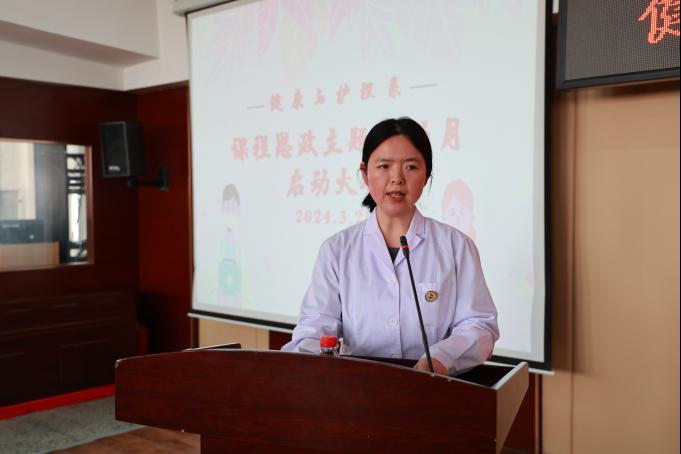 大会中首先对系部2020年以来取得课程思政建设与育人成果进行重温,共同见证近年来取得的建设成果。第二项由系主任郭玲玲宣读《健康与护理系“课程思政主题活动月”实施方案》,就活动目标、活动内容与相关要求进行说明。张静副院长做动员讲话时强调“在学校迎接普通高等学校本科教育教学审核评估的关键年,护理系能够积极主动开展课程思政主题活动,是推进全员全程全方位育人格局构建的具体实践,更是迎接教育教学审核评估工作的纵深推进,让思政教育真正走进课堂,深入学生心灵。在接下来的活动中通过开展系列讲座、教师教学竞赛、学生征文活动等丰富多彩形式让师生们更加深入地理解护理学的深刻内涵,更加明确自己作为未来护理人的角色定位。同学们积极参与到活动中来,不仅要认真听讲、深入思考,更要勇于实践、敢于创新”。