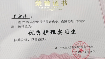 在浙江中医药大学附属第三医院实习的护理学206班于方泽同学荣获“优秀护理实习生”荣誉称号。