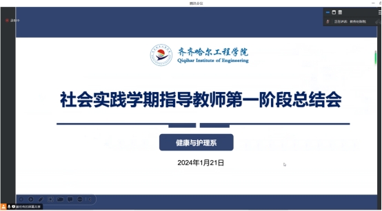 为切实推动社会实践学期的各项工作高质量开展,2024年1月21日下午,健康与护理系组织召开社会实践学期指导教师第一阶段总结会。本次会议由健康与护理系党总支副书记姜宏伟主持,健康与护理系全体指导教师参会。