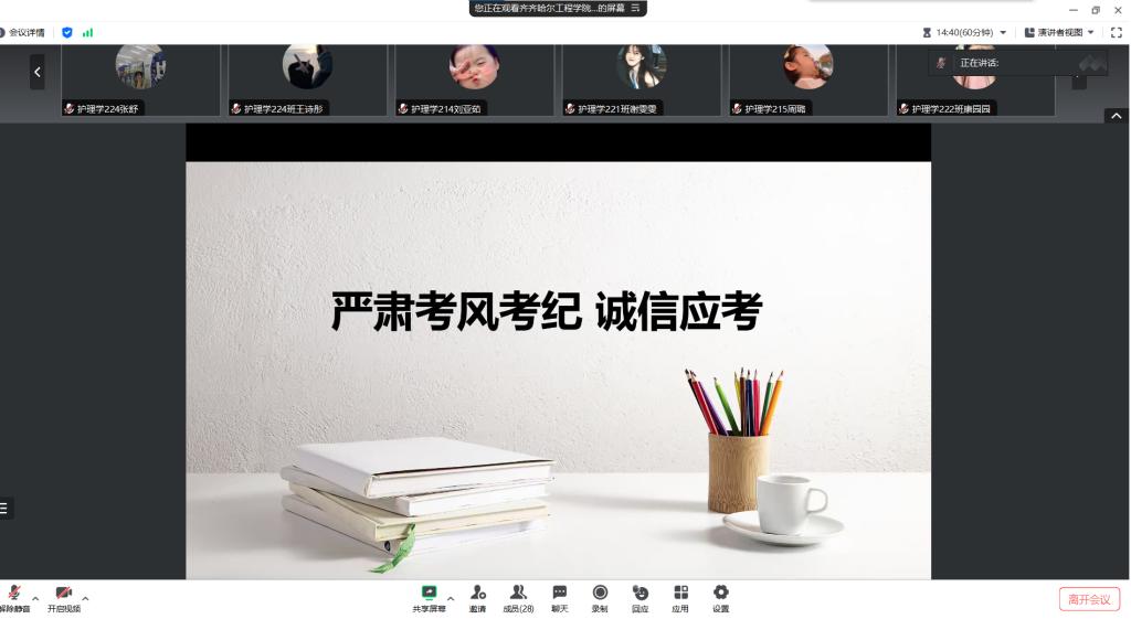 期末将近,为了端正考风,严肃考纪,加强学风建设,营造文明、诚信考试的良好氛围。为此,2024年6月4日,生涯导师于晶组于腾讯会议组织开展“考风考纪”主题会议,本此会议由生涯导师于晶主持召开,生涯组全体成员参加。