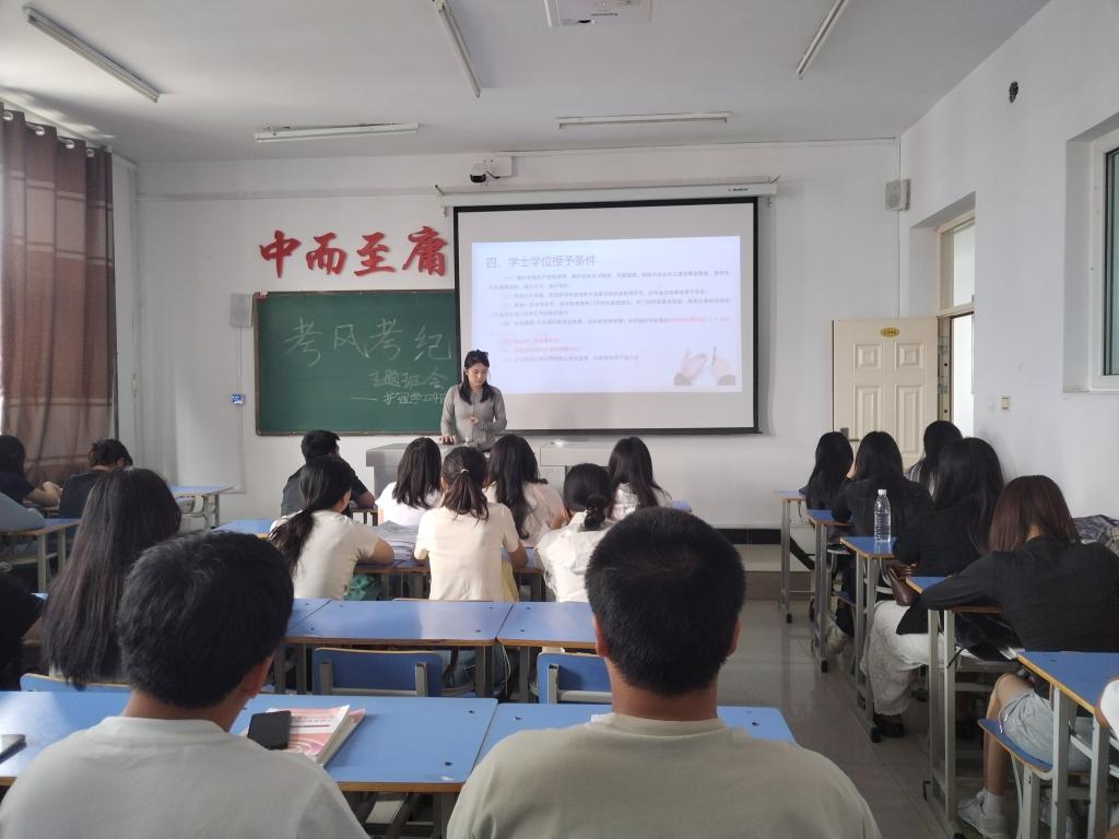 会议伊始,辅导员李安琪向同学们讲解了有关期末考试的相关事宜和注意事项,强调公平公正的考试至关重要,严肃考风考纪向同学们进行宾讲。随后,辅导员李安琪为同学们讲解了考试纪律与考场规则,考试违规处理办法以及学士学教授予条件。最后,辅导员李安琪希望大家端正学习态度,也提醒大家认真对待接下来的复习备考,取得优异的成绩。