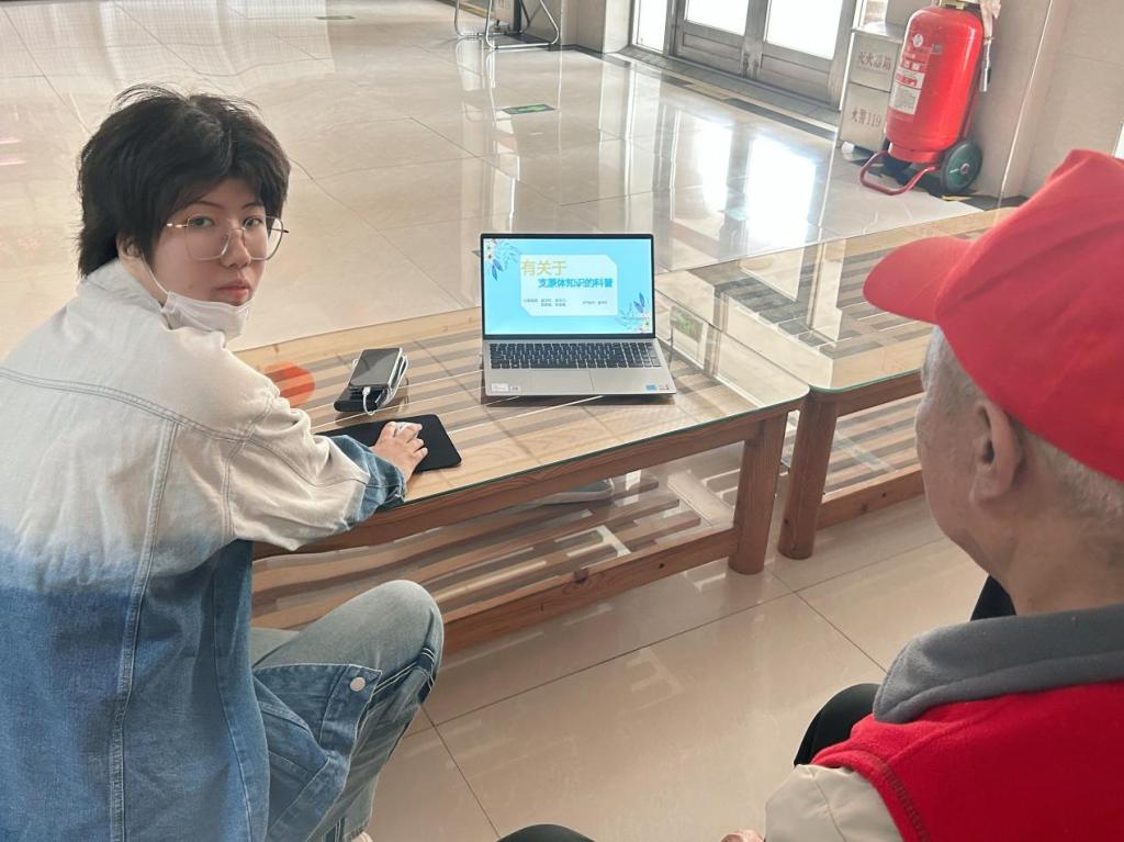 宣讲会上,盛宇轩同学详细讲解了支原体的基本知识,包括其起源、传播途径、诱发疾病的风险以及有效的防治措施。此外,盛宇轩还特意准备了互动环节,邀请老年人们分享自己的健康经验和疑问,现场气氛热烈而活跃。她耐心细致地回答了每一位老人的提问,并根据他们的实际情况提供了个性化的健康建议,深受老年人们的欢迎。