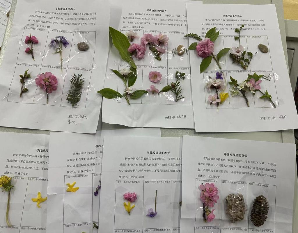 活动伊始,宣传部部长车芳菲下发表格,根据表格内容进行寻宝,参与者充分调动五感(视听嗅触味)寻找春天的校园里藏匿的宝藏。此次活动让同学们感知自然的生命力,放松身心,增强团体合作能力,激发对生活的热爱。同学们在学校的各个角落寻找宝藏,奇思妙想,足智多谋。将带回来的物品用透明胶粘在对应格子里,在规定时间内都完成了自己的作品。作品纷纷表现了与自然、与他人、与当下的联结。同学们通过此次活动感受自然,放松身心,在户外感受春天的美好,体验大自然的生机勃勃。