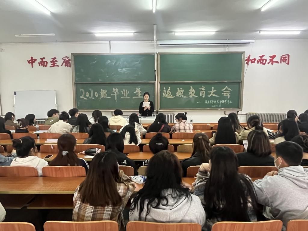 2024年4月23日16:00在1#1101开展2020年级毕业生返校教育大会。健康与护理系护理学20级全体学生参会。辅导员杨嘉琪围绕校规校纪、安全须知、就业等展开会议。