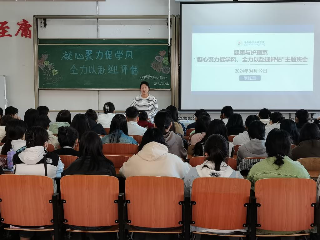 2024年4月19日,护理学(专升本二年制)235班在1#1101组织开展“凝心聚力促学风,全力以赴迎评估”主题班会,此次会议由辅导员隋钰慧主持,护理学(专升本二年制)235班全体成员参加。