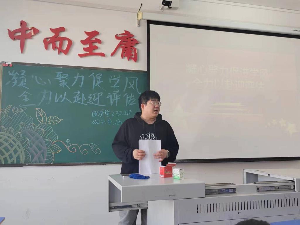 班会伊始,由辅导员孙名序老师对本次班会主题进行简要介绍,强调学风建设的重要性,以及对同学们提出期望和要求。而且还讲解教学评估的相关知识和要求,让同学们了解评估的目的和意义,以及如何积极配合评估工作。还强调让同学们重视社团活动、校园文化、社会实践、志愿服务等活动。最后,辅导员孙名序老师对本次班会进行总结,强调班级行动计划的重要性,并鼓励同学们全力以赴,共同迎接教学评估。