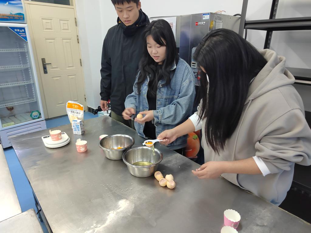 活动伊始,参与此次活动的学生自由组队,每组4-5人。学生按组进行纸杯蛋糕制作。在活动过程中有活动负责人为同学们分配蛋糕制作所需的材料并讲述制作蛋糕过程中材料的配比,在电器的使用时的注意事项。最后同学们把制作完成的蛋糕放置烤箱中烘焙同时把制作完成的蛋糕分发给参加此次活动的同学们。