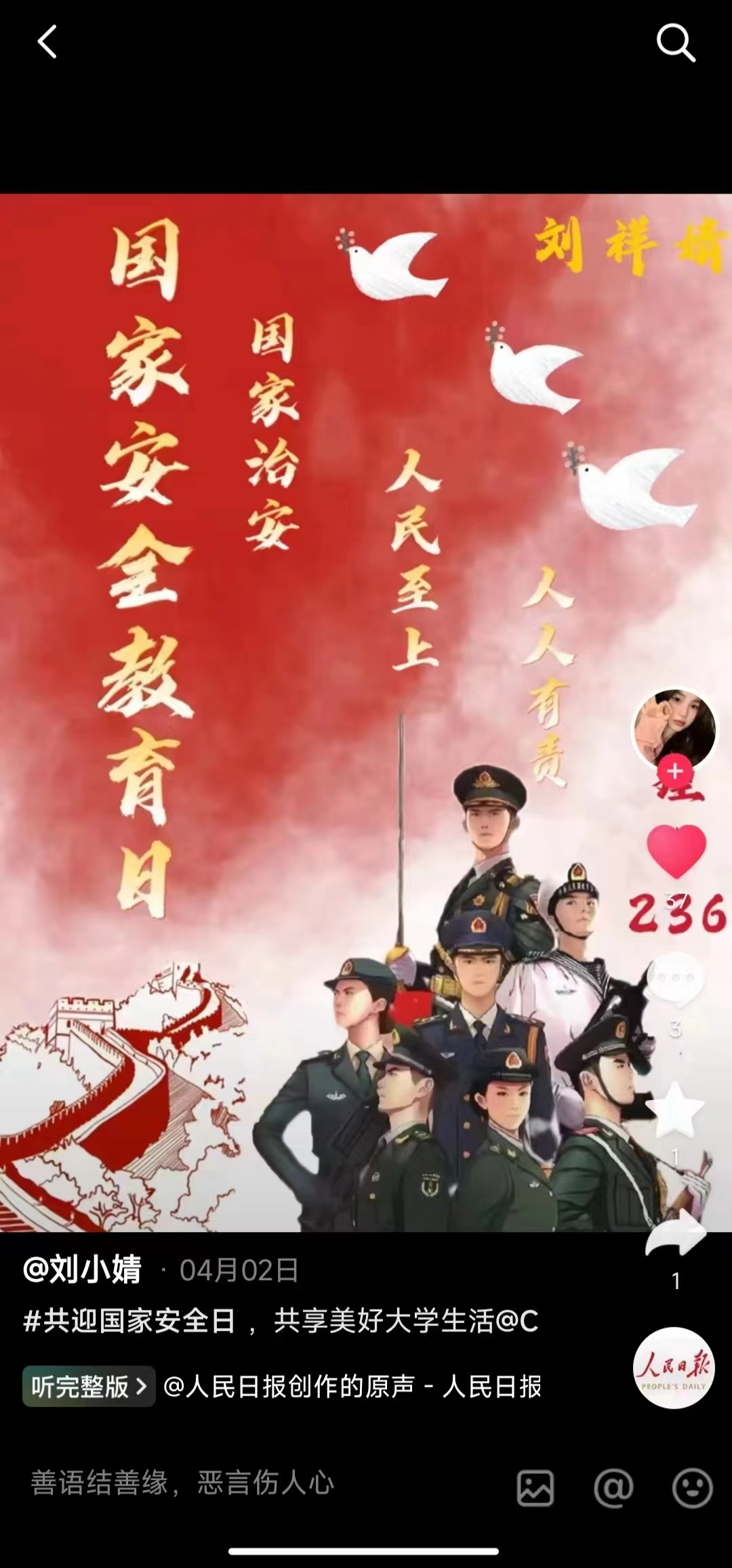 为有效推动国家安全教育的普及和深化,我系于2024年4月8日举办“共迎国家安全日,共享美好大学生活”线上活动,此次活动负责人为健康与护理系体育部部长高超,参与人员为健康与护理系学生。