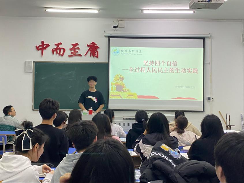 为进一步学习和实践雷锋精神,激发同学们的爱国情怀和奉献精神,护理学212班特于2024年3月26日开展“坚持四个自信-全过程人民民主的生动实践”主题团活,本次团活由团支书杨志强主持,护理学212班全员参与。