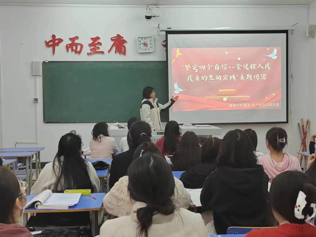 近期,助产学222班团支部组织开展了以“坚定四个自信——全过程人民民主的生动实践”为主题的团日活动,活动由团支书毕明阳主持。活动旨在通过深入学习和实践,增强团员的“四个自信”,即道路自信、理论自信、制度自信、文化自信,并促进全过程人民民主的理念深入人心。