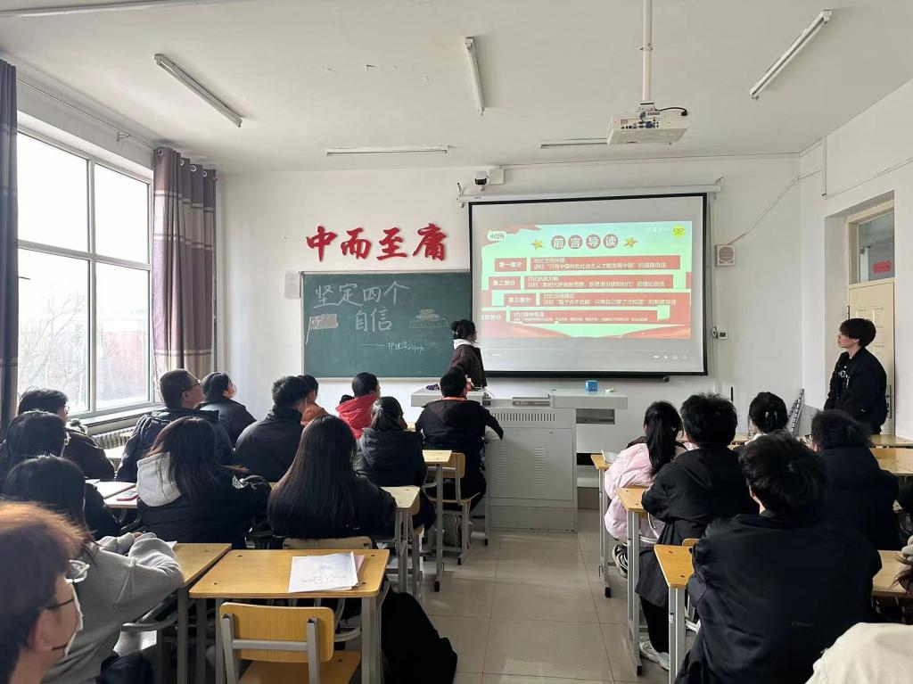 团支书李佳详细阐述了“四个自信”的内涵和重要性。强调道路自信是对发展方向和未来命运的自信,理论自信是对马克思主义理论特别是中国特色社会主义理论体系的科学性、真理性的自信,制度自信是对中国特色社会主义制度具有制度优势的自信,文化自信是对中国特色社会主义文化先进性的自信。团支书李佳通过纪录片告诉同学们如何在日常生活和学习过程中做到四个自信。最后同学们纷纷表示会积极践行全过程人民民主。