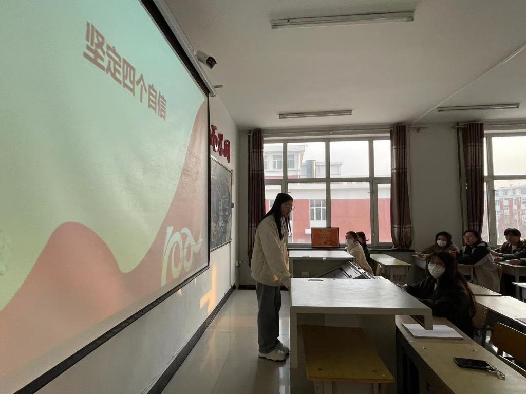 会议伊始,团支书详细阐述了"四个自信"所表的内涵和其重要性。言明道路自信根植于中国共产党领导中国人民的伟大实践,应以道路自信激励新时代青年做方向明确的掌舵者;理论自信根植于马克思主义中国化的不断开拓和创新,应以理论自信激励新时代青年做科学思想的信仰者;制度自信根植于中国特色社会主义制度的不断完善,应以制度自信激励新时代青年做国家意志的拥护者;文化自信根植于中华传统文化的深厚历史底蕴,应以文化自信激励新时代青年做智慧源泉的汲取者。最后,王颖芝强调:道路是实现路径,理论是行动指南,制度是根本保障,文化是精神力量,这四种力量统一于中国特色社会主义伟大实践,践行这四个自信需要我们每个人的努力,贵在执行、重在日常。