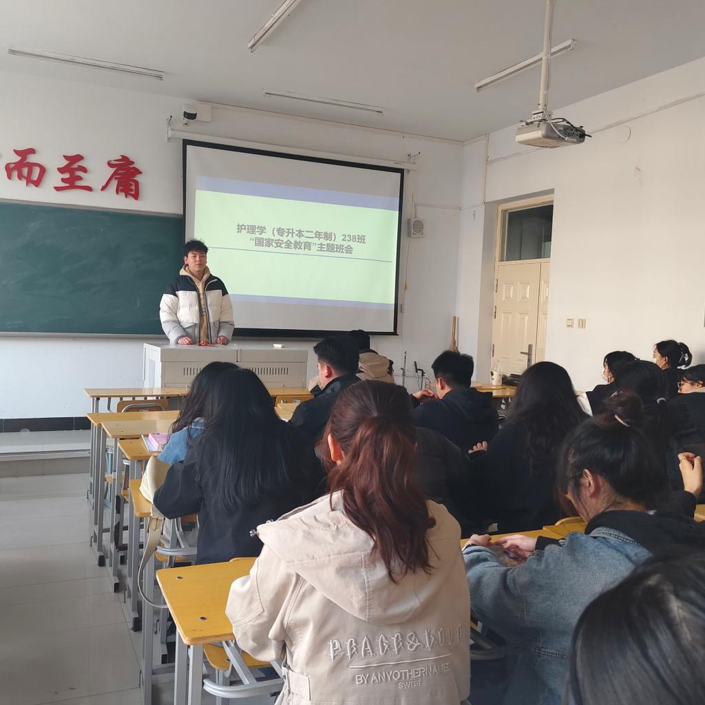 为提高全民国家安全意识,让每个人都能意识到维护国家安全的重要性,护理系(专升本二年制)238班于2024年3月22日在1教1201开展“国家安全教育”主题班会,本次班会由班长明宇主持召开,护理学(专升本二年制)238班全体同学参加。