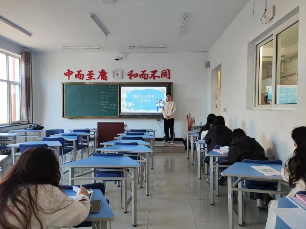 班会伊始,由班长杜朋隆用PPT的方式为同学们讲解了什么是国防以及现代国防建设包括哪些方面,让同学们了解了国防的基本内涵并掌握国防的一些基本信息,并带大家朗诵了《国防在我心中》,希望同学们可以通过这些多方面的了解来激发同学们的爱国热情,增强同学们的忧患意识。