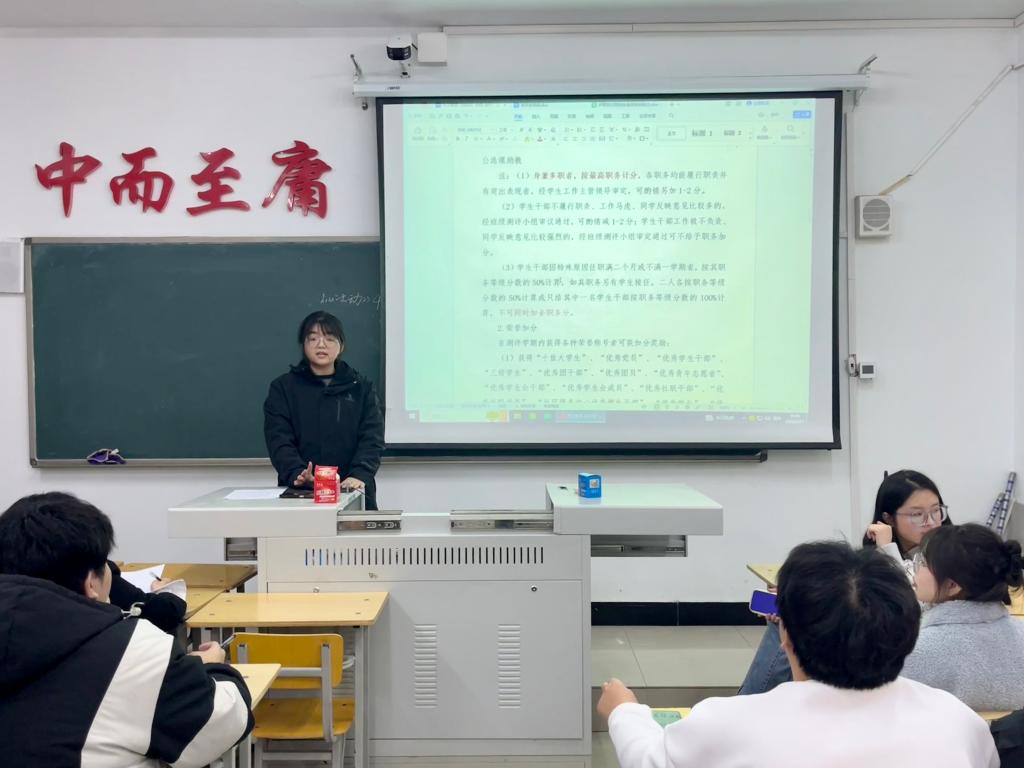 会议伊始,学习部部长孟舒首先阐述了本次培训的核心目标和奖学金评定的基本流程,强调了评定工作对于激励学生积极进取、促进学术氛围的重要性。并从学业表现、品德行为、文体表现三方面的评价指标入手,对申请条件、评定标准和评审程序进行了详尽的讲解,其中包括了奖励评分、技能大赛、社会实践、等多个维度的评估标准。培训过程中,学习委员们积极参与讨论,就班级内部特殊情况的评定方法提出疑惑,并由孟舒逐一进行解答。最后,由系学生会指导教师岳国鑫老师总结本次培训内容,她强调奖学金评定是一项严肃认真的工作,各班学委要以认真负责的态度完成此次奖学金评定任务。