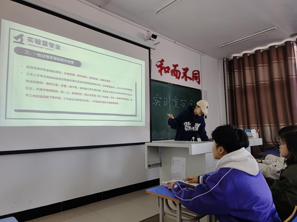 会议伊始,班长周鑫针对防止实训室意外事故发生,学生保护人身安全及健康等方面出发,向学生讲解了实训室安全知识及注意安全行为。班长周鑫针对本学期新开设的动物实验部分课程进行了详细的叮嘱,一定要带好手套和口罩,做好个人防护。仪器、药品应整齐摆放并保持台面清洁。