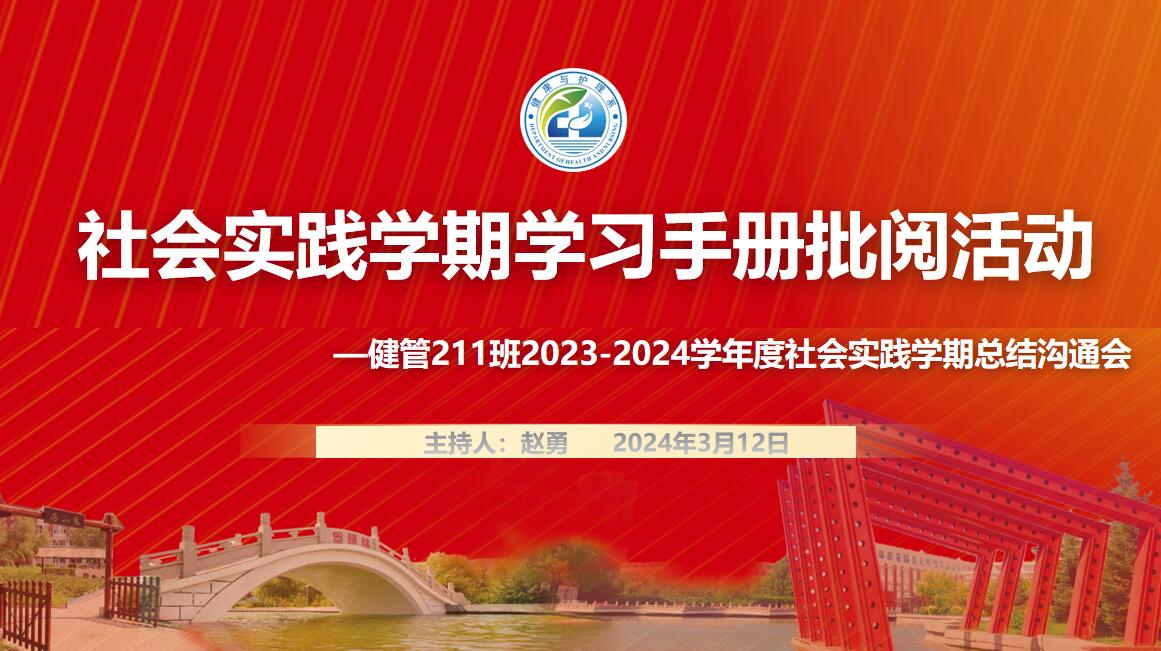 为进一步强化经验总结、凝练实践成果、突出典型激励,2024年3月12日,健康服务与管理专业2021级于1#1211教室组织开展2023-2024学年社会实践学期学习手册批阅活动。此次活动由健康服务与管理专业2021级辅导员赵勇老师主持,健康服务与管理专业2021级社会实践学期指导教师吴宪玲、刘瑞、相玉秀、韩淑梅、王洋洋参与批阅。