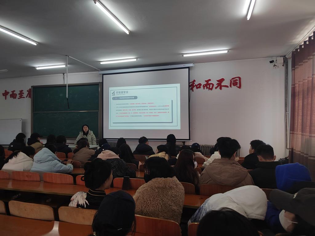 会议中,班长李慧慧通过多媒体课件和宣传视频为学生介绍了实验室的基本情况,详细讲解了实验室安全设施的摆放位置和使用方法,也展示了实验室的规章制度。通过丰富的图片、漫画、图标、视频等图文结合的方式,向同学们仔细介绍了实验室的设备安全、火电安全以及关闭门窗等注意事项。并严肃强调在实验中注意安全,要慎之又慎,需要注意:一、严格遵守“四不一问”。即“不摸、不尝、不直接闻、不带出实验室”,有实验问题解决不了 先“问老师”;二、认识危险品的安全标识。最后,班长李慧慧强调了实验室的垃圾分类,同学们要遵守实验室的操作规范。