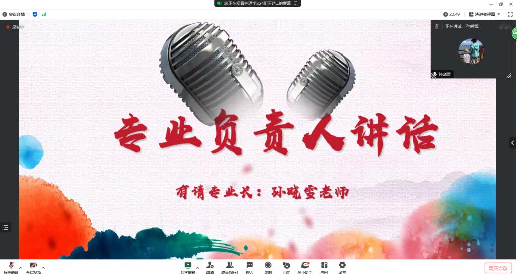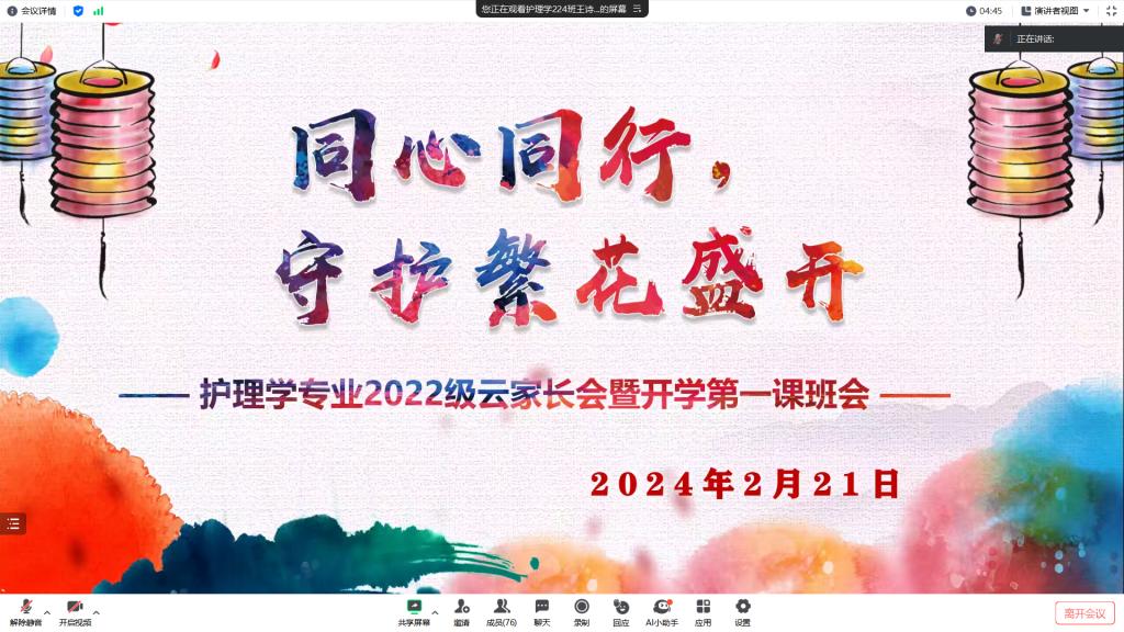 为进一步加强家校沟通,建立家校沟通渠道,2024年2月21日18:30,护理学2022级在腾讯会议组织召开家长会暨开学第一课。会议由护理学224班王诗彤主持,护理学专业负责人孙晓雪、护理学22级辅导员李安琪出席,护理学22级全体家长及同学参加。