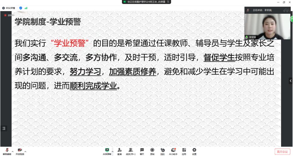 会议第一项,主持人王诗彤同学对参会的家长表示欢迎以及感谢。随后,主持人为家长们播放精心制作的视频,让家长更好地了解学生们的在校日常。会议第二项,由辅导员李安琪老师发言。辅导员老师从学院制度出发,为家长们解释了什么是学业预警及降级管理的具体处理办法,并讲述了学分绩点的重要性及如何获得毕业证和学位证。同时督促挂科的同学根据自身情况制定复习计划,进而顺利地通过补考。其次,李安琪老师传达了开学返校相关事宜以及同学们的仪容仪表等问题,并提醒同学们返校途中注意自身安全。返校后做好个人寝室卫生,合理作息,转变心态。会议第三项,由专业长孙晓雪进行发言。在此过程中,孙晓雪老师为家长们介绍了护理学专业的培养目标,并展示了学生们职业前瞻、专业知识竞赛等方面取得的成果。孙晓雪老师强调,同学们要注重提升专业技能,夯实个人能力。并建议家长督促学生完成课业要求,最后顺利毕业。会议第四项,主持人为家长们留下辅导员老师及专业长的联系方式,有问题可以及时与辅导员老师或专业长沟通,家校携手,共同助力学生成长成才。至此会议圆满结束。