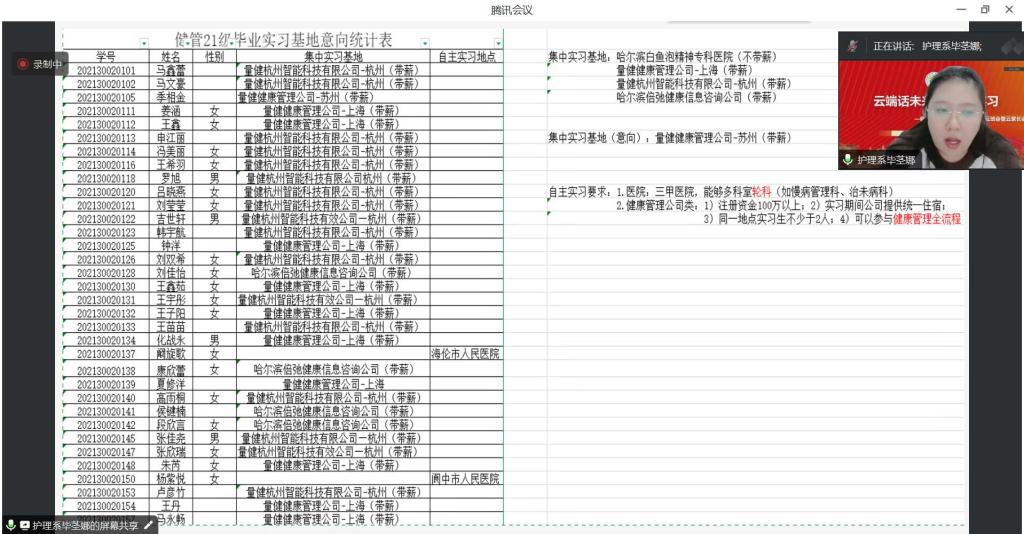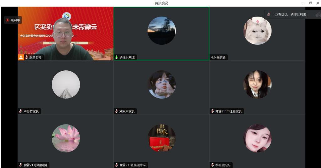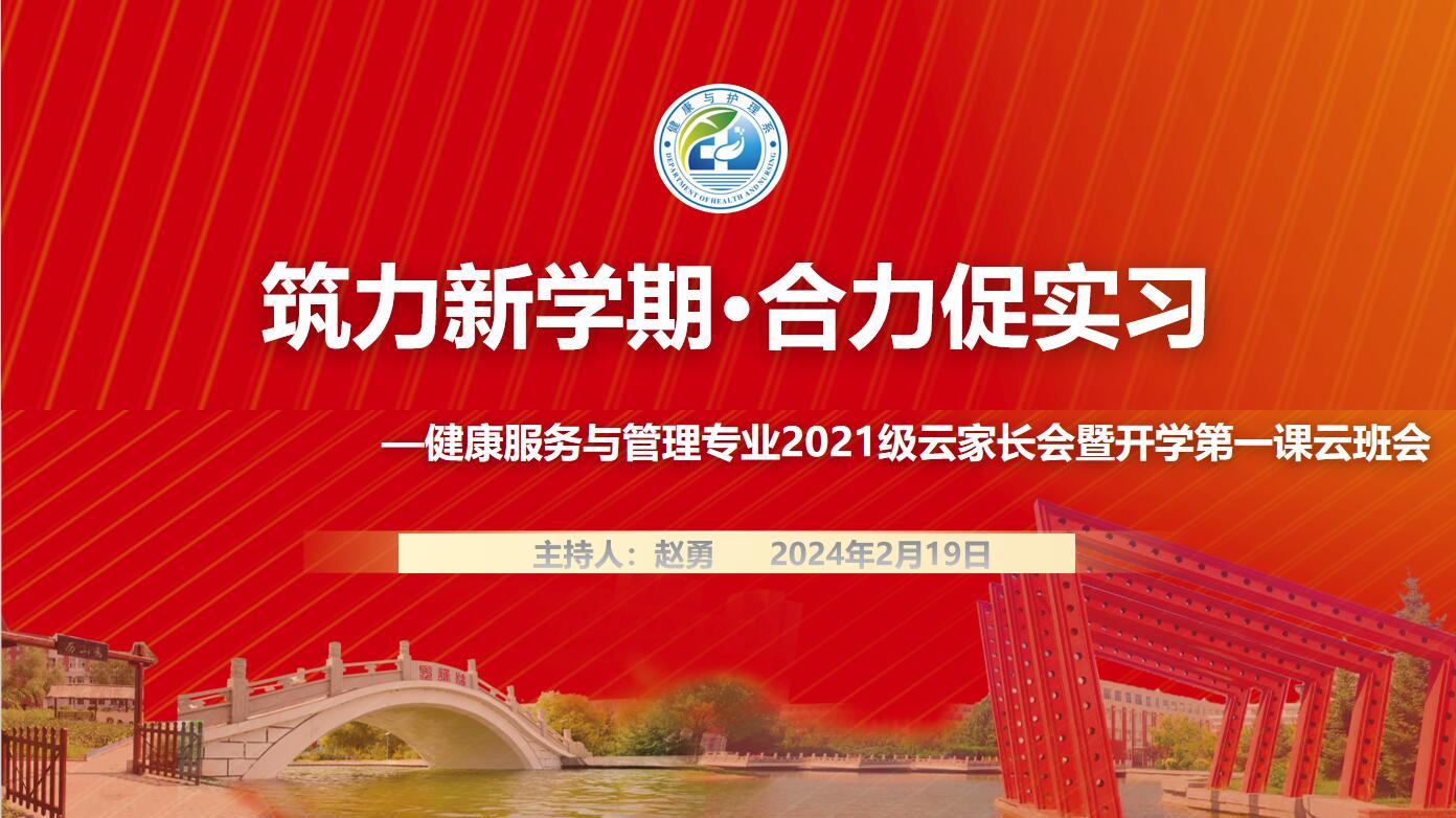 为构建家校协同育人,增进家长与学校的联系,促进家长了解学校及新学期实习安排,推动2025届毕业生实习就业工作提前化、阶段化,2023-2024学年度第二学期生活、学习。2024年2月19日晚,健康服务与管理专业2021级健管211班于腾讯会议中召开以“筑力新学期•合力促实习”为主题的云家长会暨开学第一课云班会活动,健康服务与管理专业负责人毕茎娜、专业生涯导师相玉秀、吴宪玲、王洋洋、刘瑞等老师及本专业2021级全体学生参加会议,会议由辅导员赵勇老师主持。