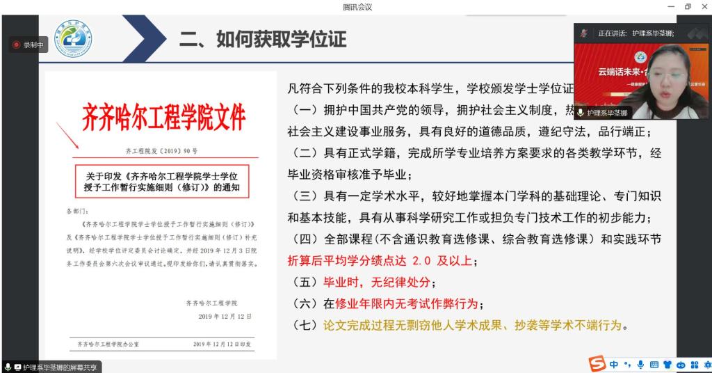 会议伊始,专业负责人毕茎娜老师以毕业、学位证获取及补授学位、实习地点选择为切入点,向全体学生及家长再次详细讲解如何顺利毕业,拿到学士学位证书,同时,结合考试违纪实例,讲解如何达到补授条件,尽快拿到学士学位证书。并就本专业5个实习地点:上海量健、杭州量健、哈尔滨倍驰、哈尔滨白鱼泡精神专科医院、自主实习如何选择与家长进行交流、沟通。会议中,辅导员赵勇老师结合近年来本科毕业生毕业数据,围绕转变观念、实习安全及要求,从就业形势变化、国家政策导向、行业发展趋势、求职找工作最佳时间、毕业生就业压力逐渐增加原因等方面,详细分析高校毕业生当下所面临的就业形势。他希望同学们能够尽快提前适应社会,充分做好个人学业规划,在实习期间严格遵守国家法律法规、校内规章制度以及实习单位的用人管理制度,注意识别各类诈骗手段,通过正规渠道租房,谨防租房信息诈骗。