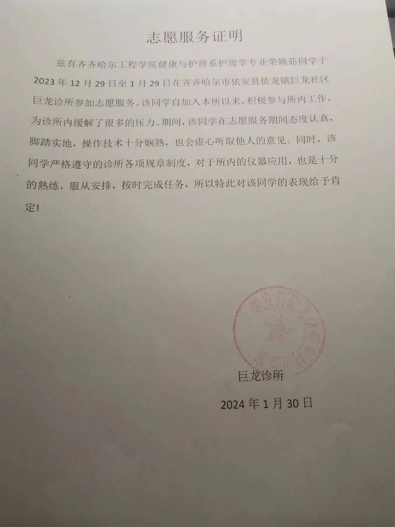 在学校本次组织的社会实践志愿服务中,荣婉茹同学为响应学校号召,于2023年12月29日起去了卫生所进行志愿服务,直至2024年1月29日,为期一个月。