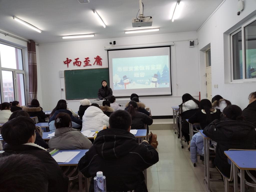 会议伊始,由辅导员李安琪讲明安全守法的重要性,使学生们牢固树立安全第一的思想。随后,辅导员李安琪告诉同学们在寒假期间要注意防盗、防火、防触电。不放烟花爆竹,防止炸伤、烧伤和火灾。时刻牢记交通安全、注意食品安全,防止传染病的发生以及注意活动安全。最后。辅导员李安琪告诉同学们,必须要树立高度的安全意识,人人讲安全,时时讲安全,事事讲安全,珍爱生命,远离事故。