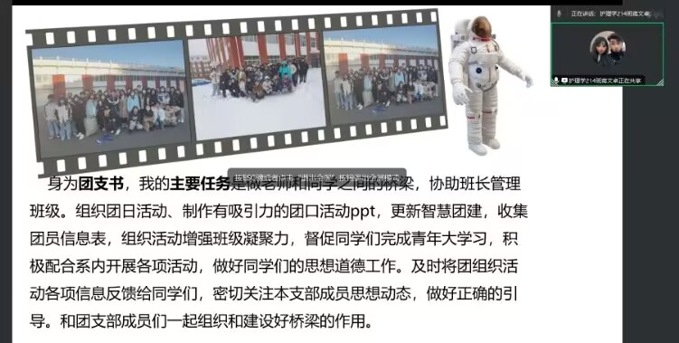 为加强班级学生干部队伍建设,了解班级存在的问题。2023年12月11日,健康与护理系护理学211-215班、健管211班、助产学211-212班,于腾讯会议组织开展“健康与护理系2021级班长、团支书述职汇报”。本次述职报告评议教师包括辅导员江丽娜、辅导员赵勇;述职汇报人员共16人,分别为8名班长、8名团支书。