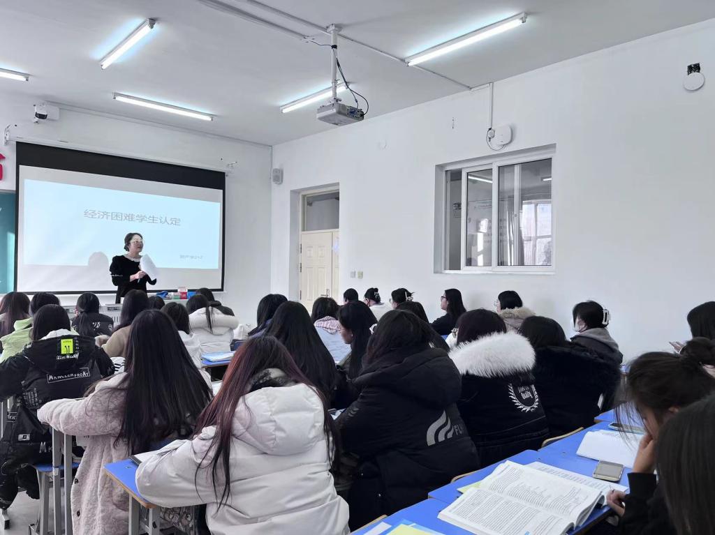 会议伊始,辅导员江丽娜讲解有关本次经济困难学生认定的重要意义,主要是为了保障家庭经济困难学生接受平等教育而实施的一项重要政策,也是高校教育公平、公正的重要体现。