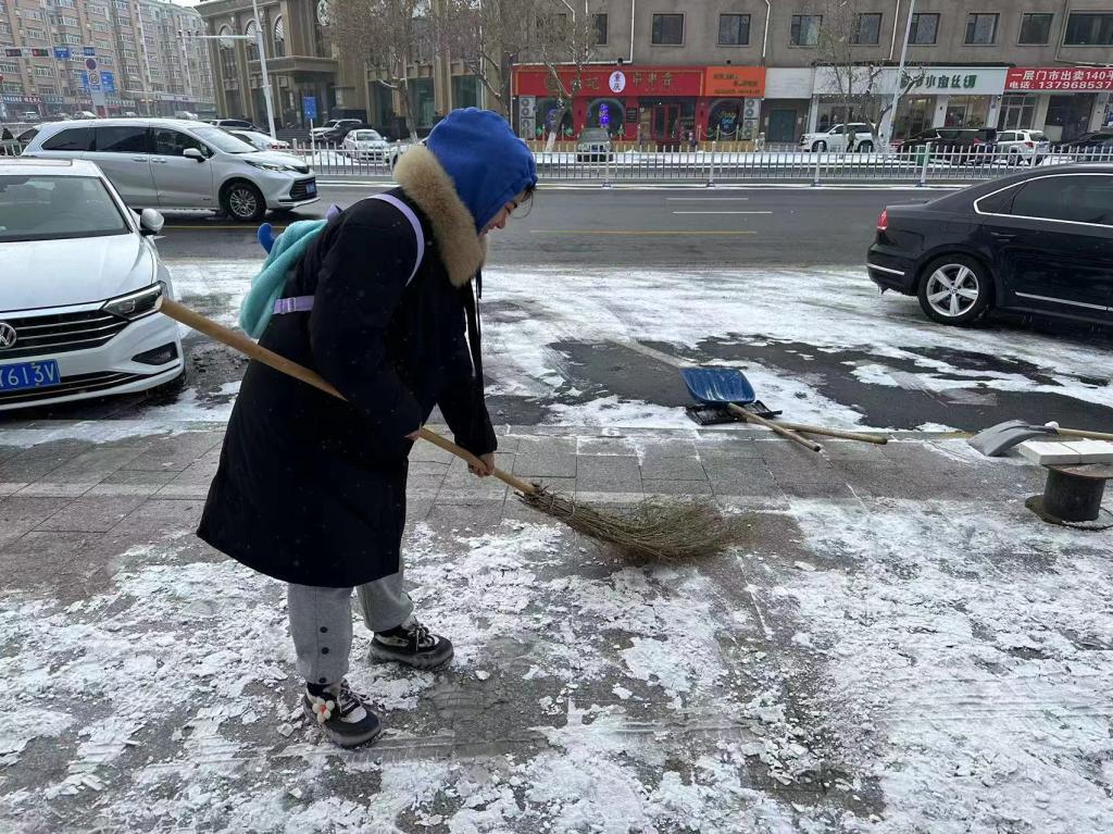 因齐齐哈尔地区大量降雪使小区内地面湿滑,积雪较多,老人行动不便 青工委员张超带领同学们清扫地面积雪。解决了老人雪天出行困难等问题。在这个过程中,大学生们不仅可以收获实践经验和个人成长,更可以发挥自己的专业知识和技能为社会做出更大的贡献。他们的积极参与也将有助于推动社会治理的进步和公益事业的发展,为构建更加和谐、美好的社会贡献自己的力量。
