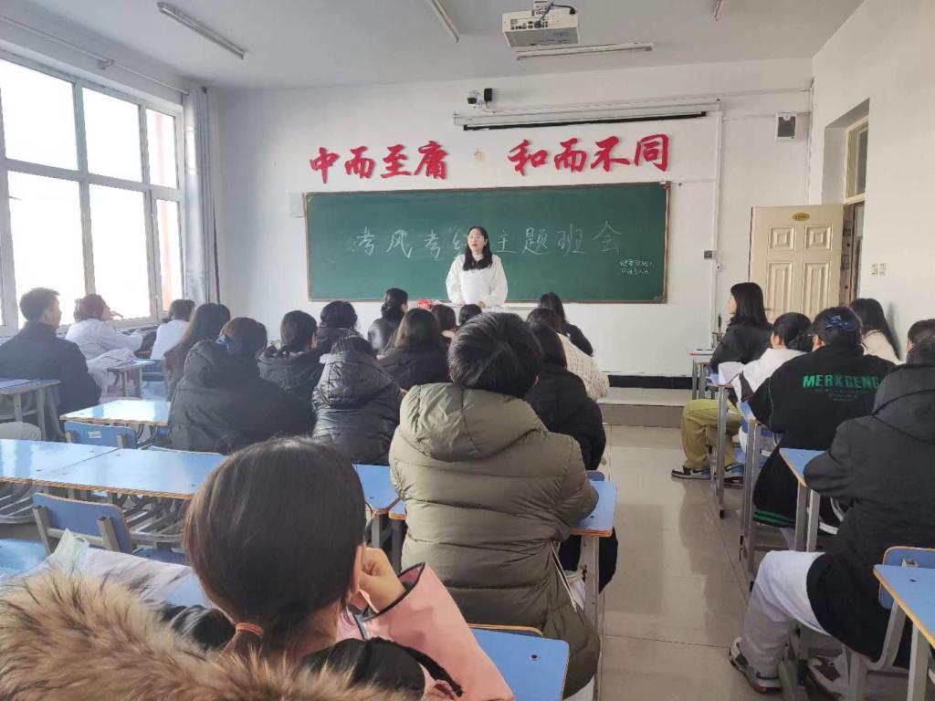 考风考纪是学校管理的重要方面,加强学生对考试纪律和道德规范的教育,有助于提升整体考试素质和学风建设。护理学214班特开展此次主题班会。辅导员江丽娜介绍了考风考纪是学校管理的基础,通过规范考试行为,维护公平公正的考试环境。并且介绍了考试时的注意事项:考试前宣布禁止、交头接耳等行为,并告知相关后果。辅导员江丽娜强调考风考纪的严肃性和重要性,并告知考试违纪的相关处理办法,同学们应树立诚信意识。严肃考风考纪,杜绝考试违纪情况发生。