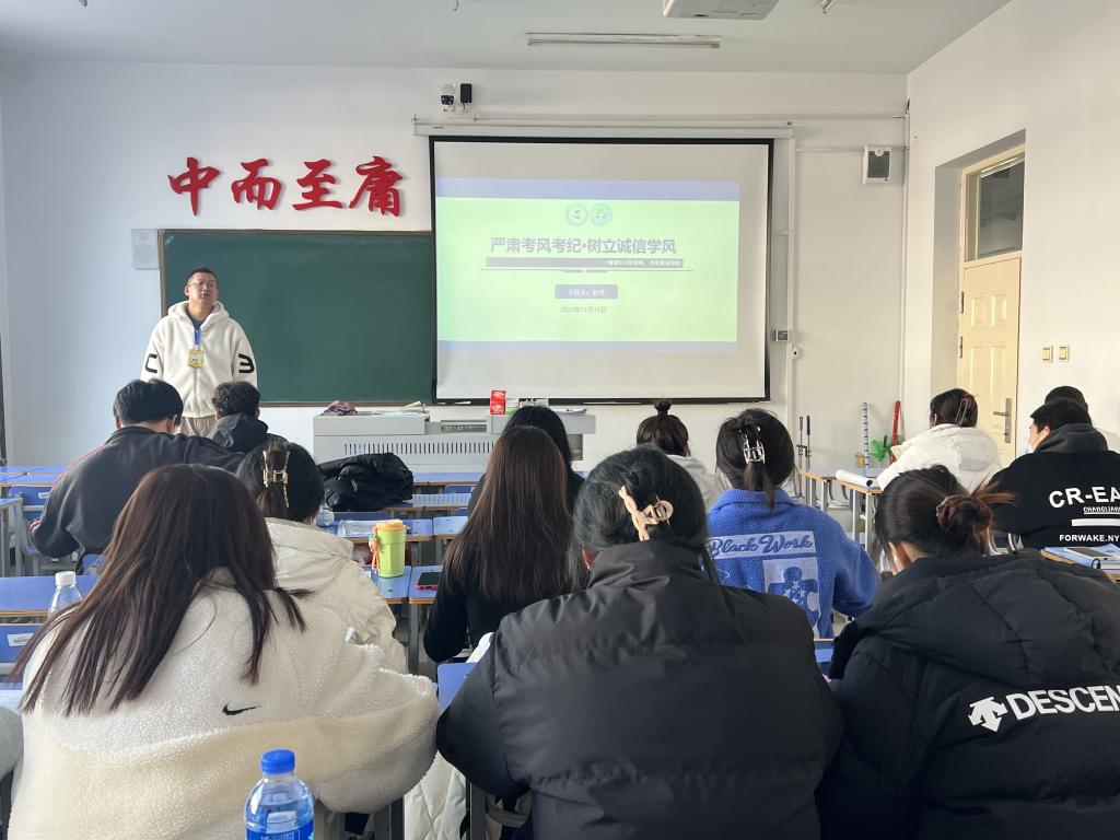 首先,辅导员赵勇老师围绕“严肃考风考纪、树立诚信学风”为主题,结合自身学习经验,向同学们分享专业课程复习的学习策略,并结合近年来发生的考试违规案例,深入分析了考试作弊对个人、对集体、对社会的危害。他指出,作为当代大学生,应当自觉遵守考试纪律,坚决抵制作弊行为,以实际行动践行诚信原则。接着,辅导员赵勇老师还向同学们介绍了学校关于考试违纪、作弊的相关制度,提醒同学们在考试过程中要认真履行诚信考试承诺,严格遵守考场纪律,坚决杜绝各种形式的作弊行为。同时,他也希望全体同学们能够树立诚信意识,以积极的态度面对考试,在考试中展示自己的真实水平。最后,同学们签订了考试诚信承诺书,赵勇老师强调,本次主题班会旨在进一步强化同学们的诚信意识,希望同学们在今后的考试中,能够切实做到诚信考试,共同维护良好的考风考纪。