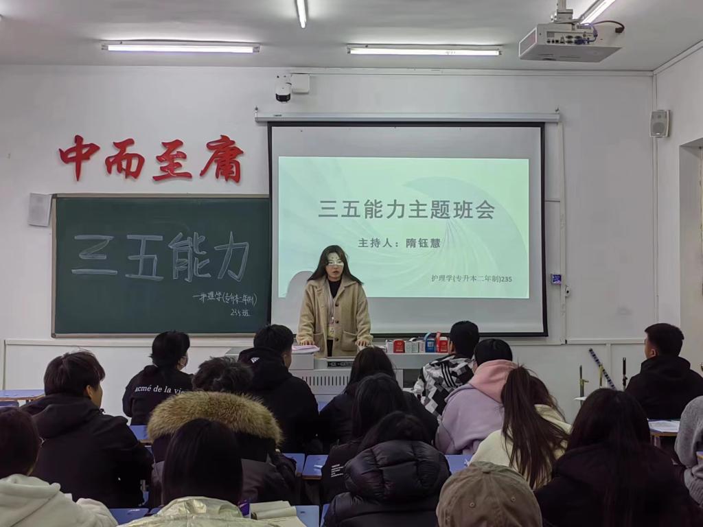 2023年11月6日,护理学(专升本二年制)235班在1#1207组织开展“三五能力”主题班会,此次会议由辅导员隋钰慧主持,本次会议由护理学(专升本二年制)235班全体成员参加。