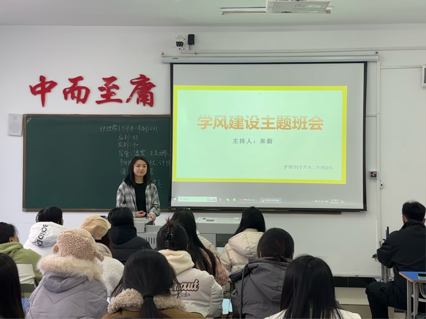 学风,是读书之风,是治学之风,更是做人之风,是一所大学的气质和灵魂,也是—所大学的立校之本。学风建设是衡量一所高校办学思想、教育质量和管理水平的重要指标,是全面推进素质教育,为社会培养高素质人才的关键。2023年10月31日,护理学(专升本二年制)231班于1#206组织开展 “学风建设” 主题班会。本次班会由辅导员米新主持召开,护理学(专升本二年制)231班全体成员参加。
