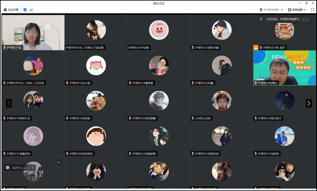 新学期已经过半,为了解同学们阶段性的学习成果及学习中遇到的困难,也为使同学们能够在接下来的学习过程中够积极进取,迎难而上。2023年10月17日晚召开期中学业指导会,由于于晶老师在外参加培训,此次会议采用线上形式。本次会议由护理学221班孟舒主持,于晶、杨建宇老师组生涯学生参会。