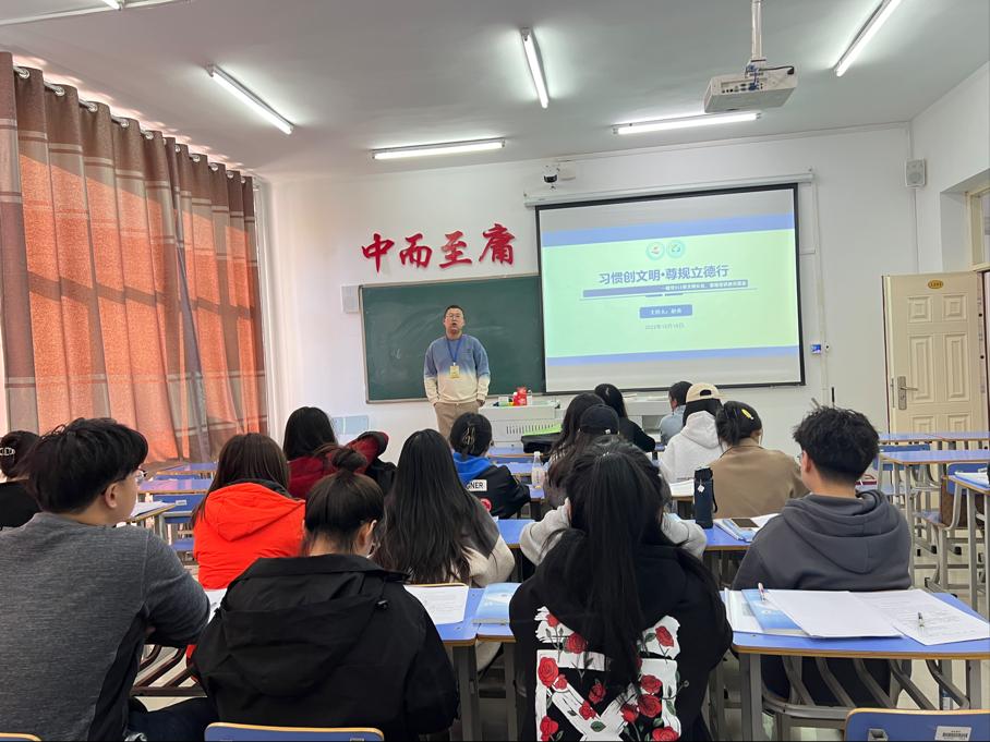 接着,辅导员赵勇强调在校园内要注意言行文明,见到老师要问好,不在禁烟场所吸烟,在课堂上认真听课,不看课外书籍、不睡觉,积极参与讨论,积极回答老师问题等。最后,辅导员赵勇对本次班会进行了总结,强调了文明礼仪和常规常识的重要性,并鼓励同学们在日常生活中践行文明礼仪,做一个有道德、有素质、有魅力的大学生。