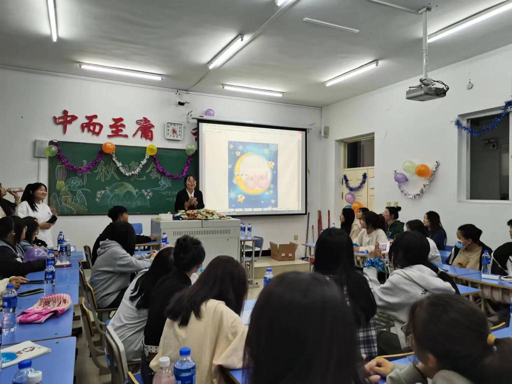 活动伊始,辅导员邱瀚宁老师展开宣讲,希望各位同学积极参加此次晚会,认真体会中华优秀传统文化,融入到今晚这场晚会中感受节日的温暖,来自节日的力量,不仅如此,辅导员邱瀚宁老师还带来了一箱月饼送温暖,来传承中秋节传统文化。