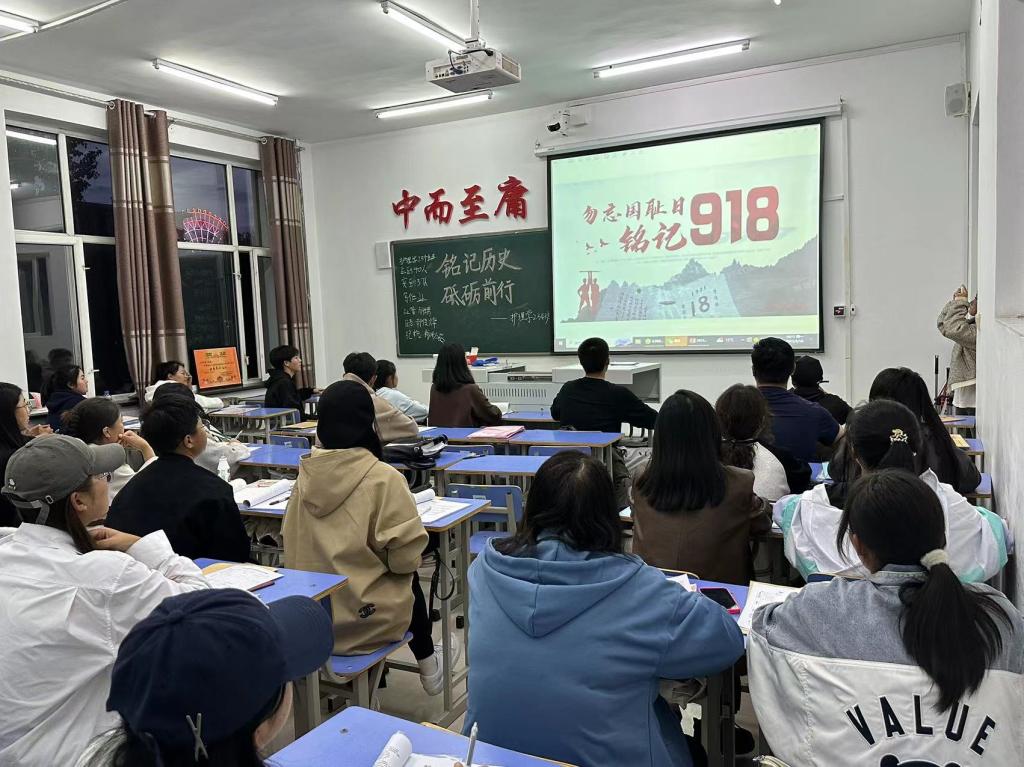 团活伊始,团支书李佳带领同学们齐唱国歌,通过观看爱国主义影片,全体同学见证了先烈们如何在绝境中以顽强的斗志,浴血奋战,拼尽全力至死守住日寇的侵犯。同学们被壮士们至死不渝的精神所震撼,唤醒了大家对那段历史的记忆,激发了大家的爱国主义情怀和个人使命感。通过此影片同学们明白了“我们从来不是生在一个和平时代,而是身在一个和平的国家。”青春似火江山如画。人知耻而后勇,国之耻而富强。不忘柳条湖,铭记918。青青子襟,泱泱中华。为崛起而读书,平屈辱而投戎。国耻当永记,迟早需要还。倭寇不仁,人人诛之。知耻后勇,强我中华。
