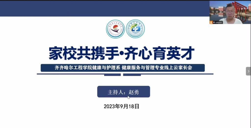 为强化沟通联系,达成家校育人共识,帮助全体学生及家长了解当前就业形势及后期实习意向选择。健康服务与管理专业组织2020级、2021级全体学生家长于2023年9月18日在腾讯会议会议中召开“家校共携手•齐心育英才”为主题的云端家长会活动。会议由辅导员赵勇老师主持,健康服务与管理专业专业负责人毕茎娜老师及全体学生参会。