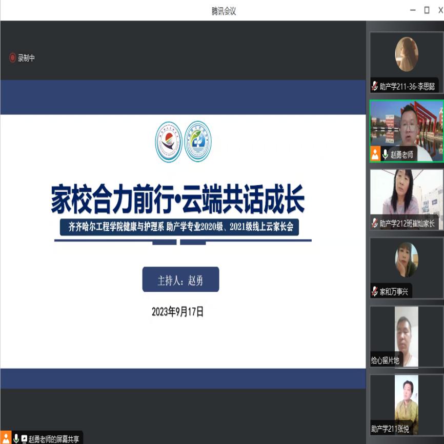 为促进家校沟通,加强学校与家庭、教师与家长之间的密切联系。2023年9月17日,健康与护理系助产学专业2020级、2021级组织开展以“家校合力前行•云端共话成长”为主题的线上家长会。本次会议由助产学专业2020级辅导员赵勇老师、2021级辅导员江丽娜老师共同主持,助产学专业专业长孙畅老师及助产学专业2020级、2021级全体家长参会。