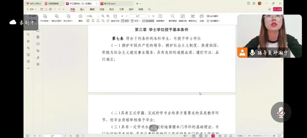 议伊始,辅导员邱瀚宁老师向大家解读了关于学士学位授予条件,要求全部课程和实践环节折算后平均学分绩总到达2.0以上,毕业时无纪律处分,无作弊行为等学生方向拥有学士学位证书。随后又对新生军训进行了总结,同时也说了网络安全的重要性。