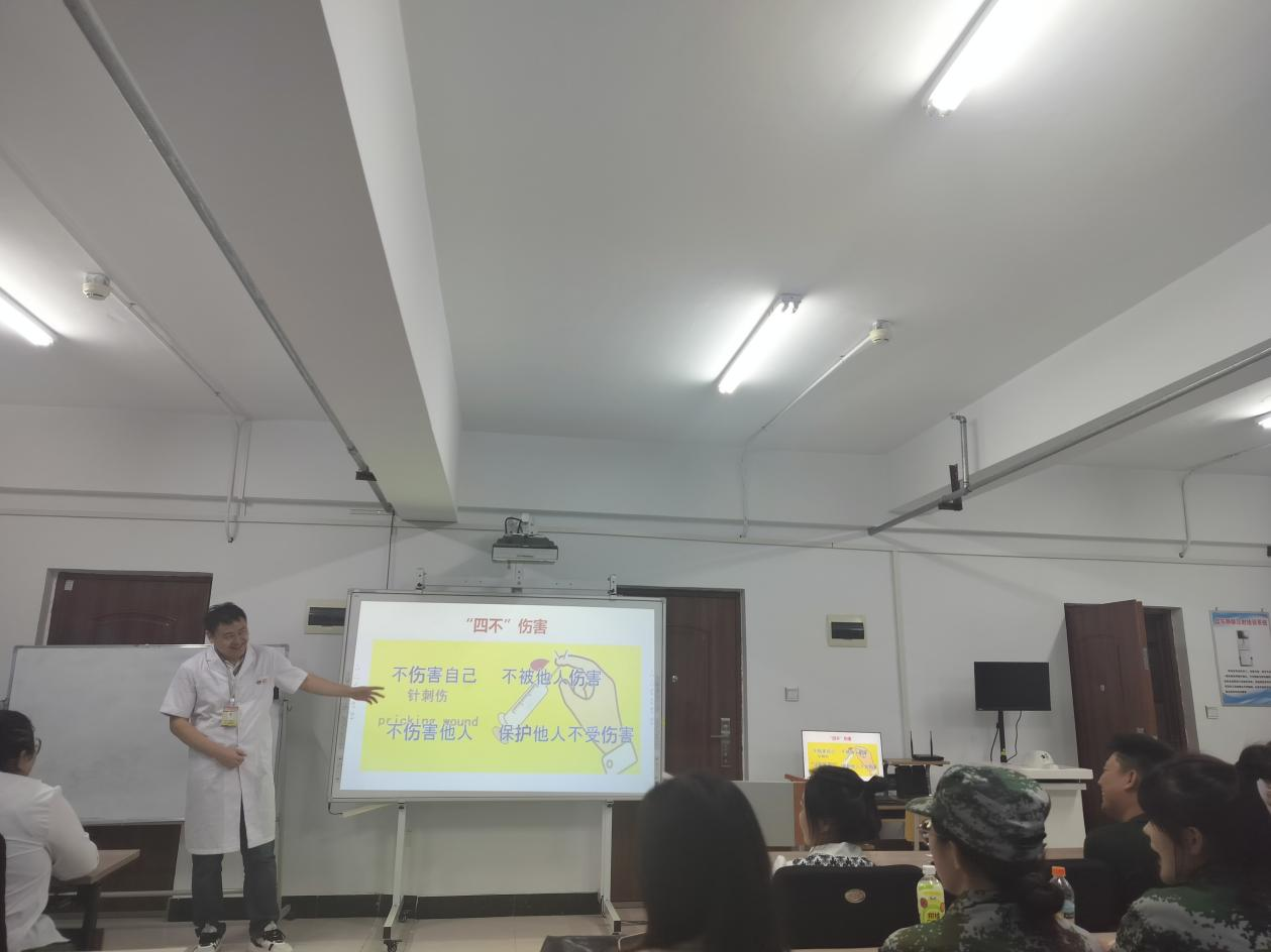 而后杨建宇老师又详细叙述了各类型发生后的紧急处理措施并给同学们引进了职业暴露的概念。众所周知职业暴露与护理专业的同学们息息相关,其中同学们更应在实训操作中避免锐器伤的发生。例如规范操作、进行护理操作的过程中要保证光线充足、禁止用手直接接触使用后的针头和刀片等、都可以在一定程度上避免职业暴露的发生。若因疏忽被锐器刺伤,也要保持镇静,首先立即由近心端向远心端挤出局部血液,其次用肥皂水和清水清洗并消毒包扎,然后将被暴露的黏膜用生理盐水或清水洗净,最后报告上级进行进一步处理。