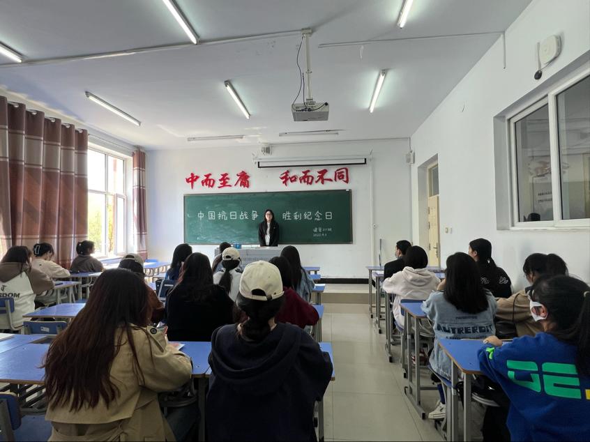首先,团支书张欣瑞向同学们介绍了78年前的9月3日,中国人民经过14年浴血奋战,打败了日本军国主义侵略者,取得了中国人民抗日战争的伟大胜利。接着,团支书张欣瑞表示,同学们一定要珍惜现在的美好生活,爱护好自己的家人朋友,并且祝愿中华民族伟大复兴的中国梦能早日实现!最后,团支书张欣瑞播放国歌,带领同学们一起高歌。