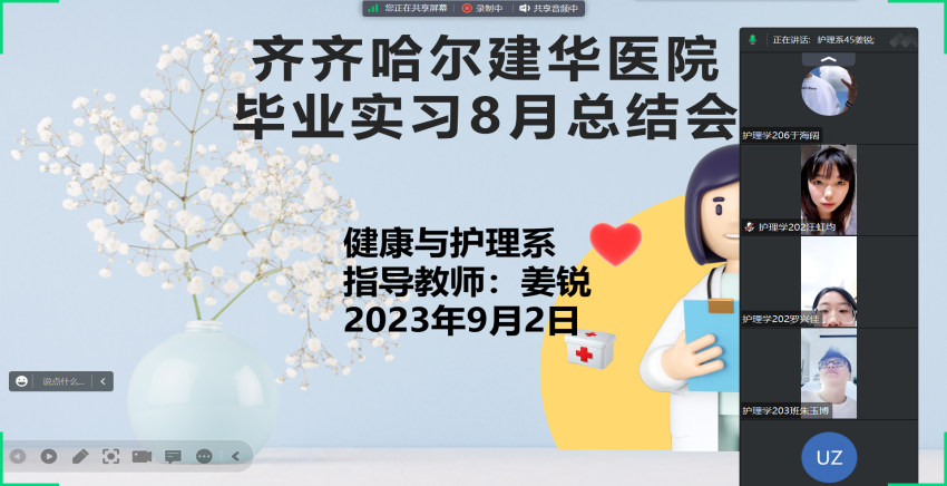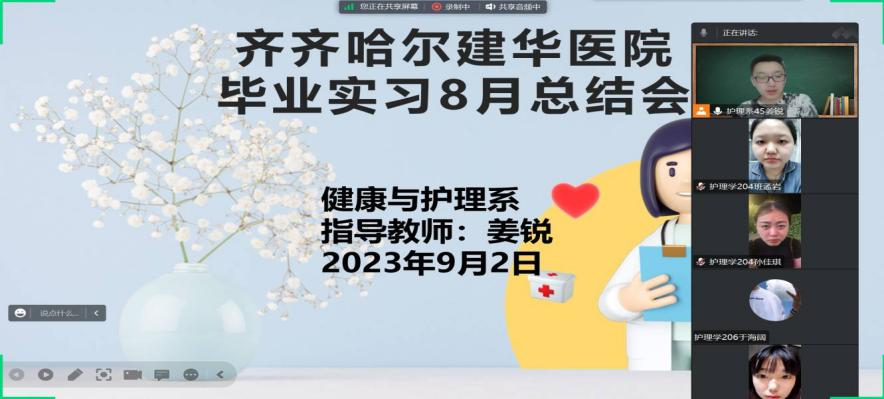 2023年9月2日,指导教师姜锐老师在腾讯会议上组织开展了齐齐哈尔建华医院毕业实习8月总结会,20级建华医院毕业实习生参加。