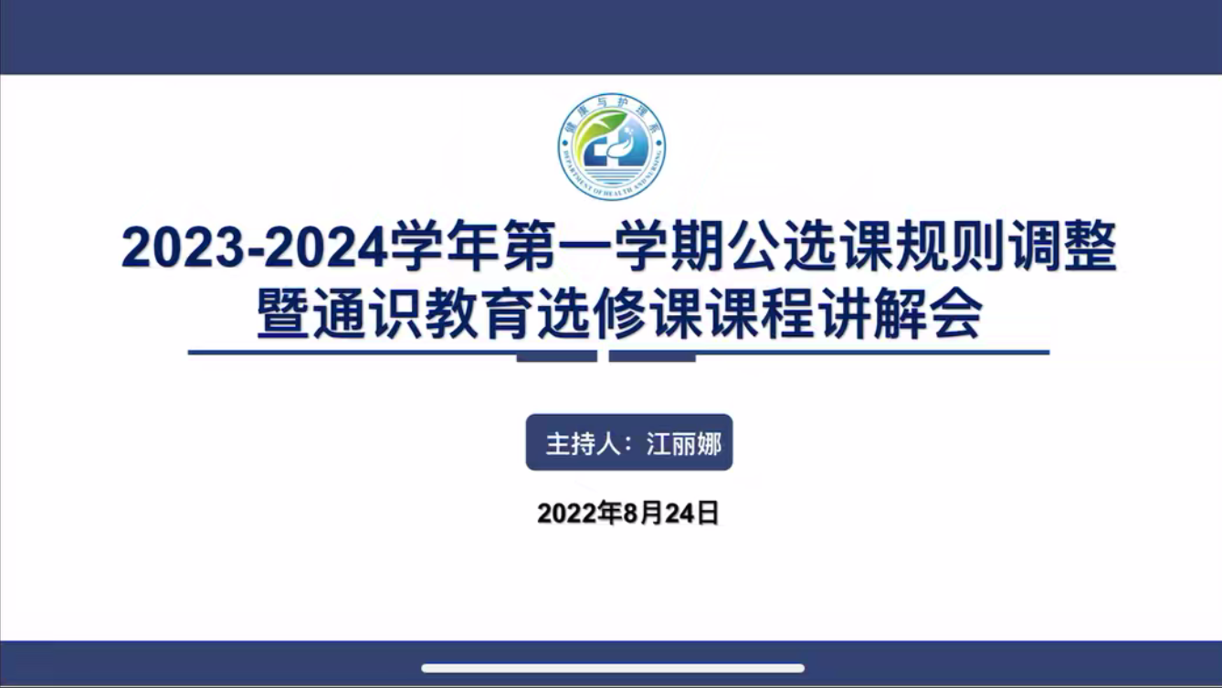 为加强同学们对公选课的了解,更好的学习选修课程。健康与护理系护理学211班于2023年8月24日于线上组织开展2023-2024学年第一学期公选课规则调整暨通识教育选修课课程讲解会。本次班会由辅导员江丽娜主持,护理学211班全体参与。